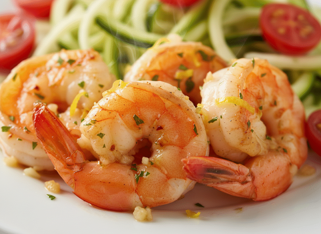 Succulent garlic herb shrimp served over fresh zucchini noodles with cherry tomatoes and a light lemon sauce — low sodium, low potassium, heart-healthy, and ready in 20 minutes!