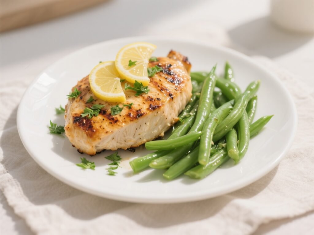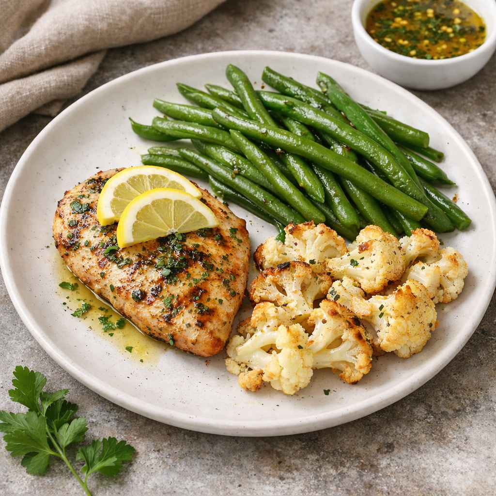 A bright, zesty complete meal featuring herb-marinated chicken breast, tender-crisp green beans, and golden roasted cauliflower — low sodium, low potassium, and heart-healthy.