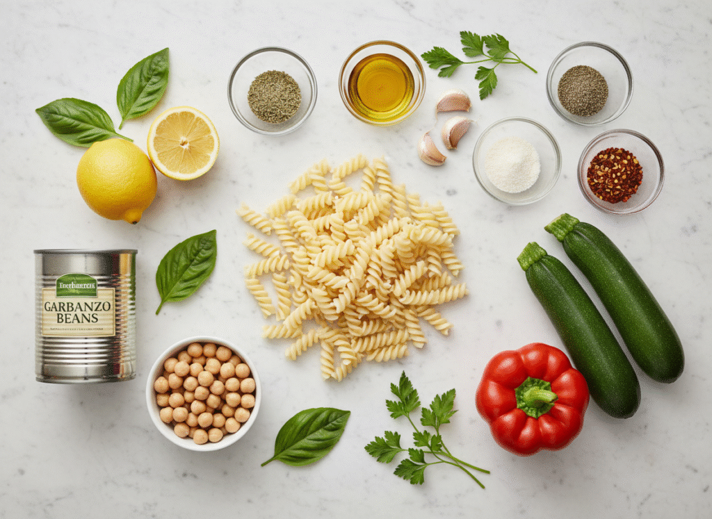 ๐ Plate: Divide pasta among 4 bowls, making sure each serving has vegetables and chickpeas. Garnish with fresh basil leaves and optional toasted pine nuts (use sparingly). Serve with lemon wedges on the side.