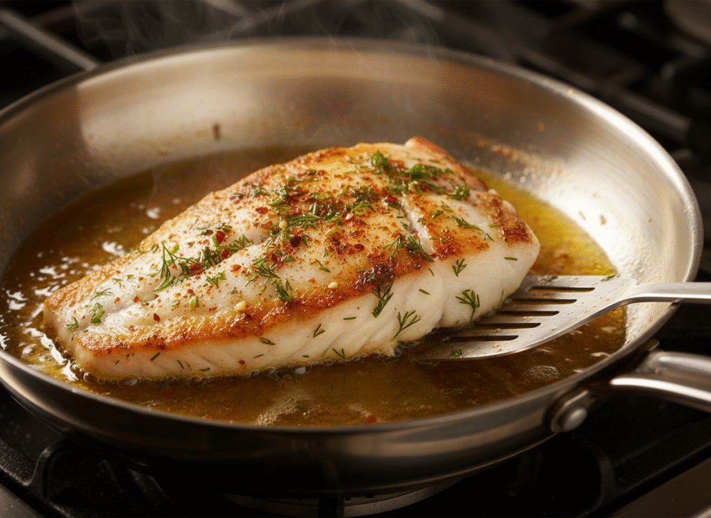 6️⃣ Sear Fish: Place fish fillets in the hot pan, presentation side down. Cook for 3-4 minutes without moving until a golden crust forms. Carefully flip and cook for another 3-4 minutes until fish is opaque and flakes easily with a fork (internal temperature should reach 145°F/63°C).
