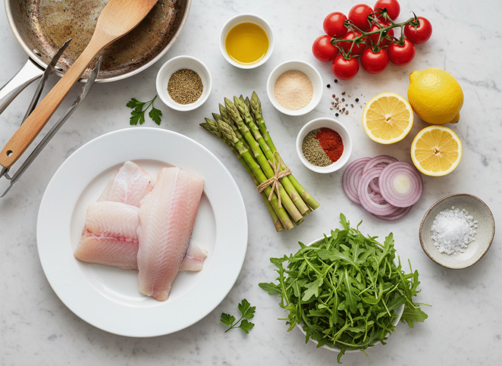 🔟 Assemble: Divide arugula salad between two plates. Place roasted asparagus spears alongside the salad. Top with pan-seared fish fillet. Garnish with fresh herbs and lemon wedges. Serve immediately.