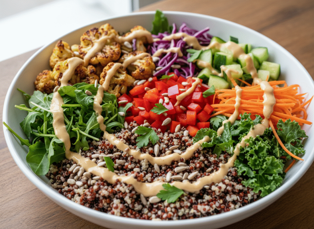8️⃣ Arrange Vegetables: Arrange roasted cauliflower, diced bell pepper, purple cabbage, shredded carrots, and cucumber in colorful sections on top of the greens.